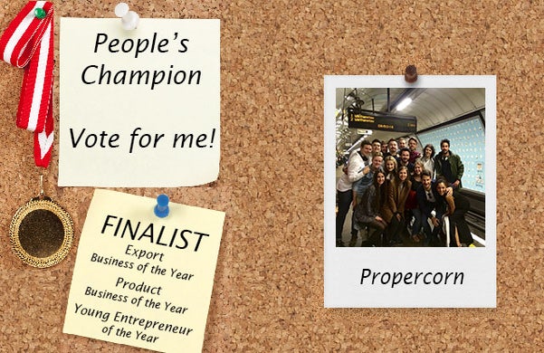 People’s Champion Finalist: PROPERCORN One of the UK’s fastest growing snack brands, does this guilt-free popcorn start-up have what it takes to be your People’s Champion? Written by Megan Dunsby Published on October 12, 2015 Our experts We are a team of writers, experimenters and researchers providing you with the best advice with zero bias or partiality. Start-up name: PROPERCORN Founders: Ryan Kohn and Cassandra Stavrou Started in: 2011 Based in: London Business description: Low-calorie, gluten-free popcorn rangeShortlisted categories:Export Business of the Year Product Business of the Year Young Entrepreneur of the YearThe PROPERCORN story:The official snack of London Fashion Week, sales of three million packs a month and revenues of over £5m; PROPERCORN is quickly becoming a start-up success story. In fact it has emerged as the fastest growing snack brand in the UK and it’s easy to see why.Co-founder Cassandra Stavrou came up with the idea for PROPERCORN after watching fellow workers purchase snacks for the afternoon slump which left them feeling guilty or dissatisfied. Determined to “create a snack without compromise”, she quit her job aged 25 and began popcorn making.Fast-forward to 2015, Stavrou and co-founder Ryan Kohn’s gluten-free, vegetarian-friendly popcorn range; which comes in at under 130 calories; has taken the foodie world by storm.With flavours ranging from the traditional sweet and salted to coconut and peanut butter, it is now stocked with over 10,000 retailers including Waitrose, Selfridges and Boots and employs a team of 30 staff; alongside 60 student ambassadors.Sales haven’t just been limited to the UK either. Exports have become a major focus of the business with its “popcorn done properly” stocked in six countries including Holland, France and Belgium and plans to launch into a further eight markets soon. Determined to keep moving, the business recently branched into clothing with popcorn-covered jumpers and tees, and held a two-day workshop to inspire young entrepreneurs.Why PROPERCORN made our 60:Stavrou and Kohn are great examples of what can be achieved when you take a great business idea and turn it into a reality. The duo’s business has successfully infiltrated the saturated snack market and with turnover set to rocket, we’re confident that PROPERCORN will go from start-up to scale-up.Where to find out more about PROPERCORN:Website: www.propercorn.com Twitter: twitter.com/PROPERCORN Facebook: facebook.com/Propercorn Share this post facebook twitter linkedin Written by: Megan Dunsby